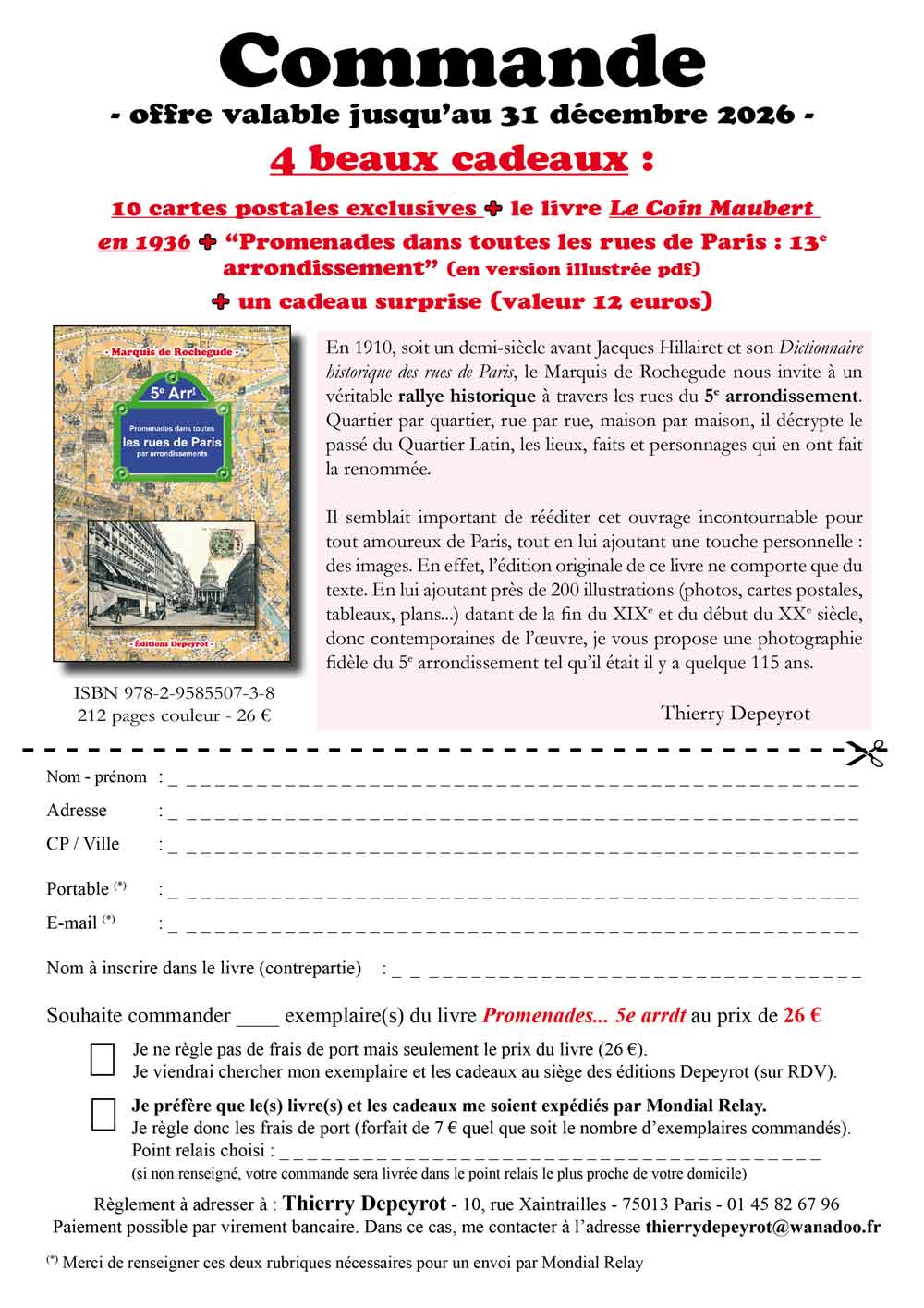 Ce site vous propose de découvrir toute une gamme de livres et revues consacrées à la Bièvre et à l'histoire des 5e et 13e arrondissements de Paris. La revue Histoire & Histoires a été créée en mai 2008 par Thierry Depeyrot. Se basant sur une collection exceptionnelle de plusieurs milliers de documents, photos, plans et cartes postales anciennes, cette revue vous propose un contenu original à l'iconographie rare. A ce jour, il existe 24 numéros de cette revue, ainsi que deux hors-séries. D'abord spécialisée sur le 13e arrondissement, la revue a abordé le thème de la Bièvre. Le livre De Guyancourt à Paris... La Bièvre en est le logique prolongement. S'il existe un point commun entre le 13e arrondissement et la Bièvre, c'est bien le voisin 5e arrondissement : la revue Histoire & Histoires du 5e est donc née en 2014 et compte à ce jour 4 numéros. Thierry Depeyrot est également l'auteur du livre Artisans et commerçants du 13e, et a édité les deux livres de Fred Morisse, Un Hiver de chien et Sous le ciel rouge de mai qui évoquent le siège de Paris et la révolution sanglante de la Commune. Vous trouverez les sommaires de tous ces ouvrages ainsi que, si vous le désirez, leur bon de commande dans le menu de gauche. La revue Histoire & Histoires vous propose très régulièrement des expositions sur des thèmes variés. Thierry Depeyrot |